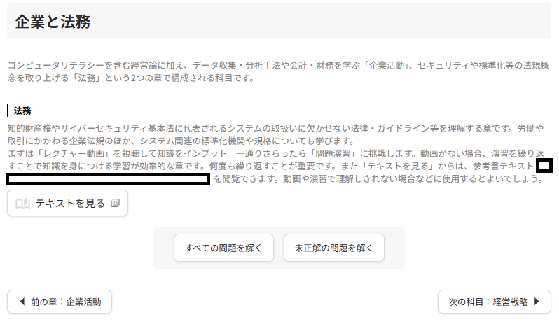 2025年11月10日 / 最終更新日時 : 2025年11月10日 ety おしらせ ITパスポートの参考書をPDF版で見る場合 自宅学習コースの場合は参考書を本ではなく、PDF版で見ることになります。例えば法務について学習する際はレクチャー動画はありませんので、画面にある『テキストを見る』ボタンを押すと別タブで開きますので見ながら学習を進めていけます。慣れると簡単ですのでお勧めです。